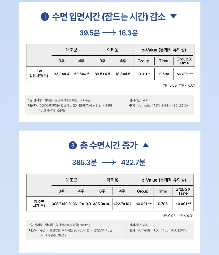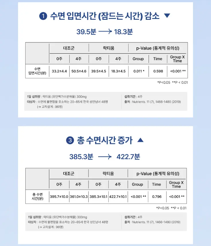 따뜻한 우유를 먹고 잠든 아기의 평온함에서 착안한 성분입니다. 락티움은 뇌의 GABA 수용체에 작용하여 긴장·스트레스 반응을 완화하는 원료입니다. 인체적용시험 결과, 4주간 섭취 시 입면 시간 감소와 총 수면 시간 증가 등 전반적인 수면 효율 개선이 확인되었습니다.
