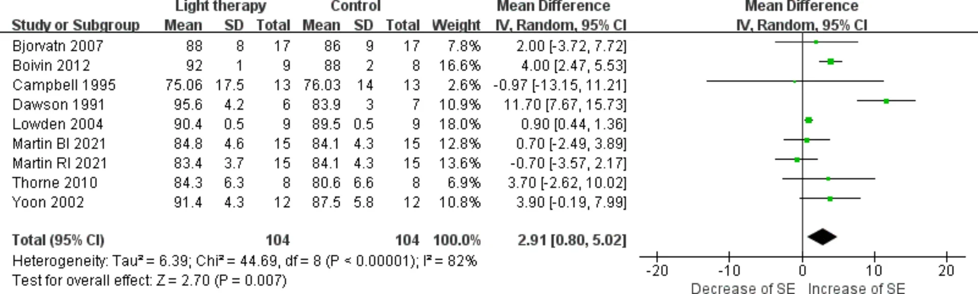 교대근무자들을 대상으로 한 임상시험들을 모은 결과, 빛 치료(밝은 빛 노출)를 받은 그룹이 대조군보다 수면 효율이 전반적으로 더 좋은 방향을 보였다 (출처 - Scientific Reports)